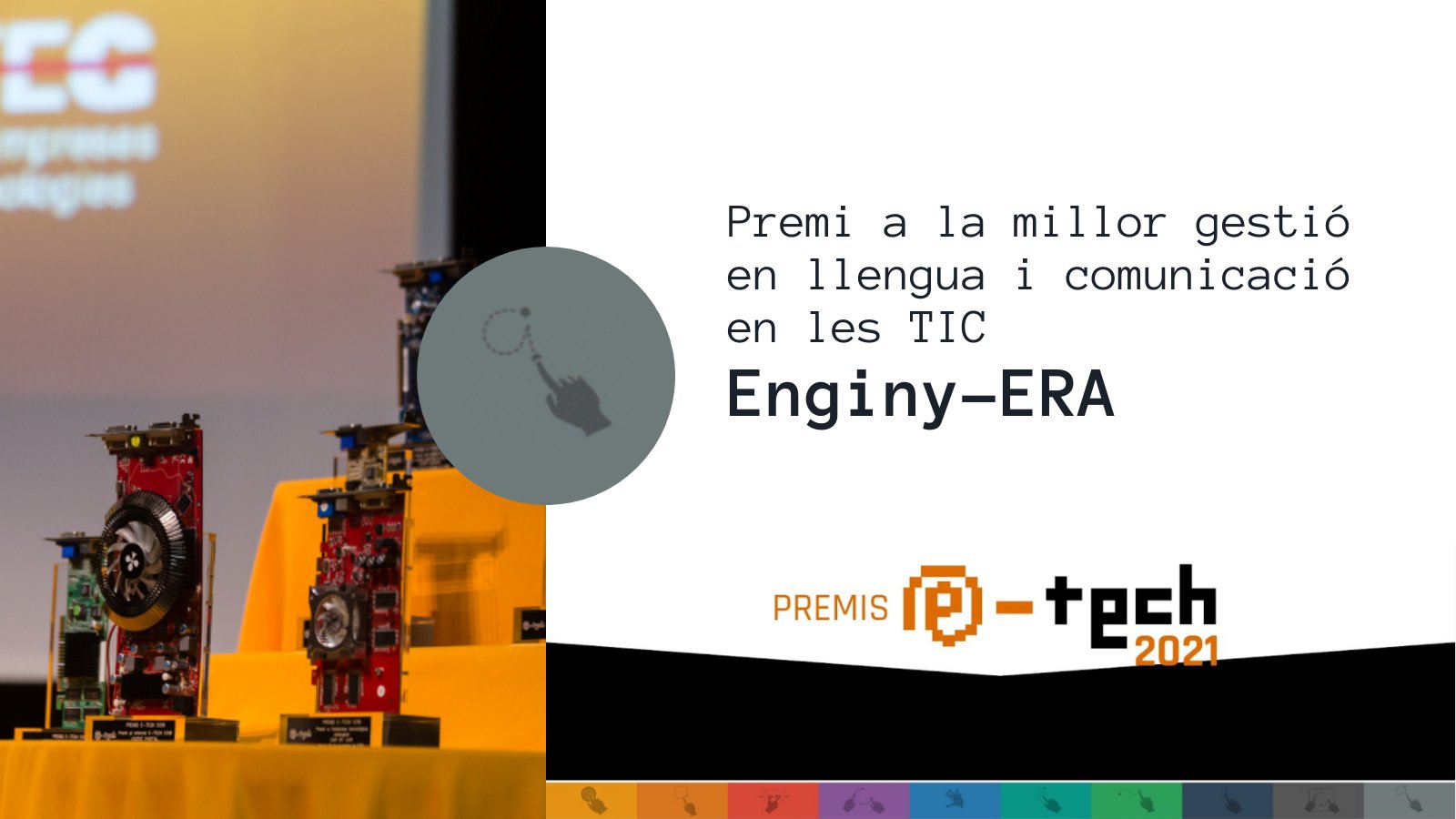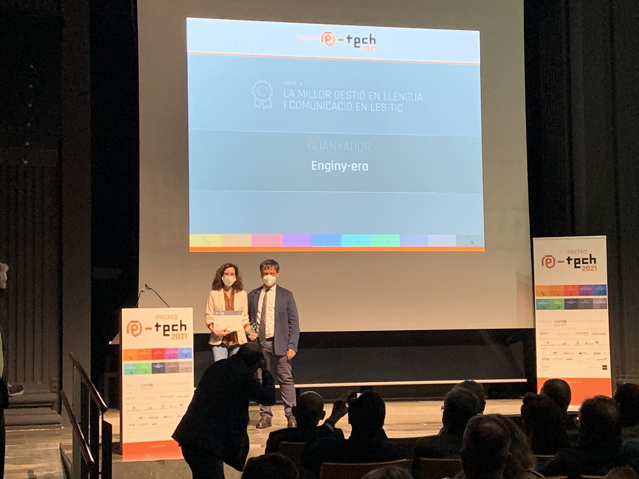 < Volver a "1. Premios y Reconocimientos"ENGINY-era ganó, en noviembre de 2021, el Premio E-TECH a la Mejor gestión en lengua y comunicación en las TIC y quedó finalista al premio E-TECH especial del público al mejor proyecto, producto o servicio tecnológico para el proyecto Vesteix-Tech.