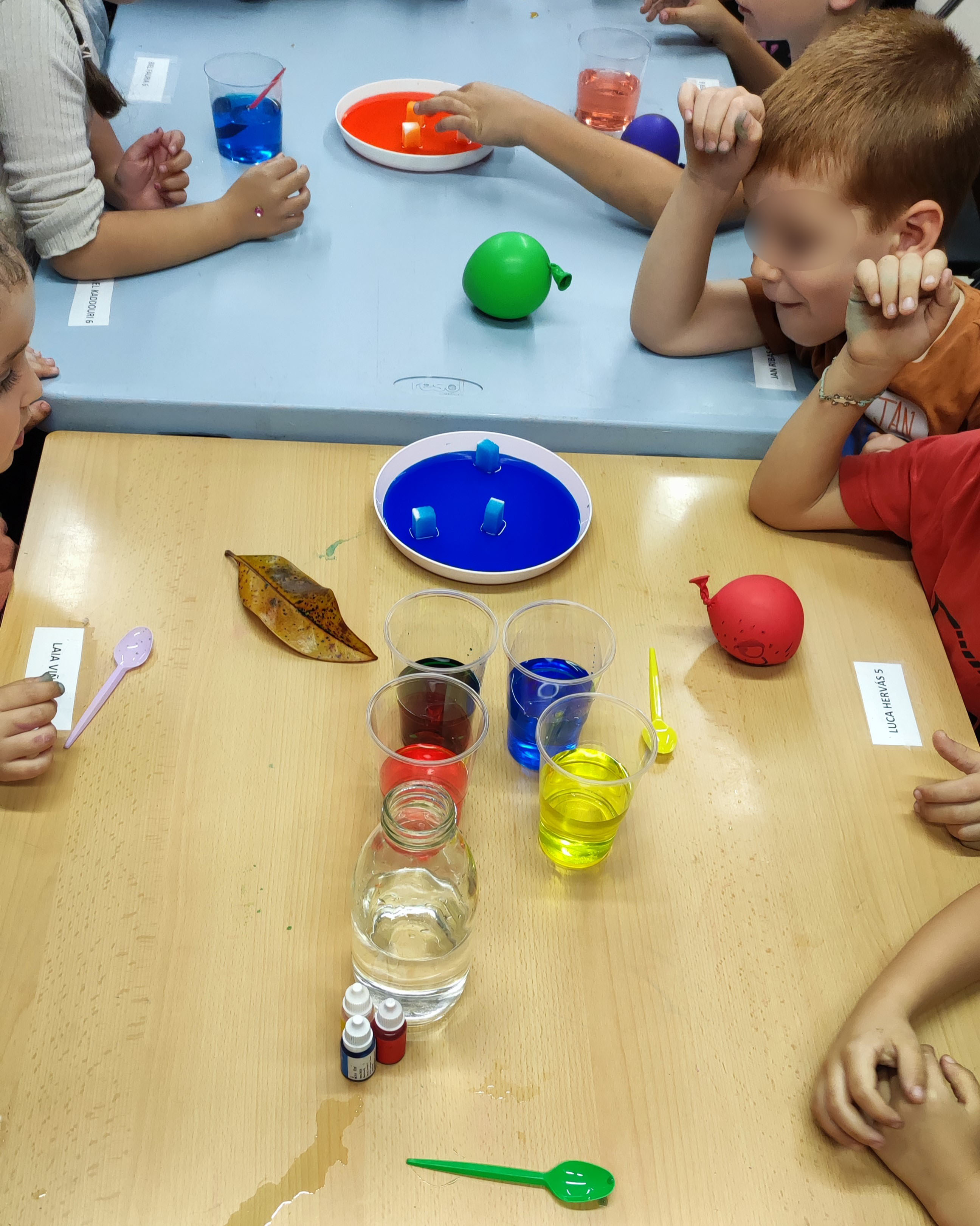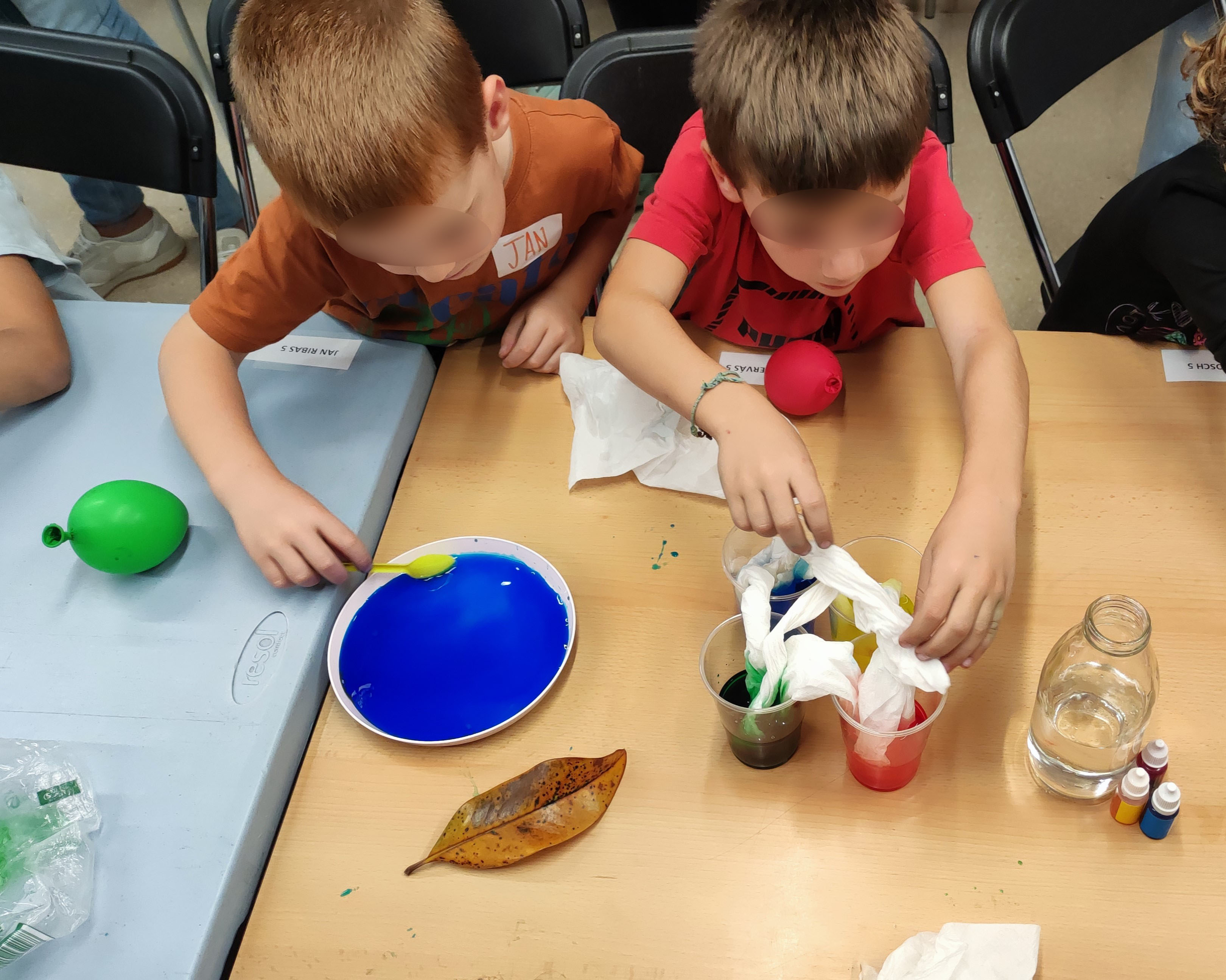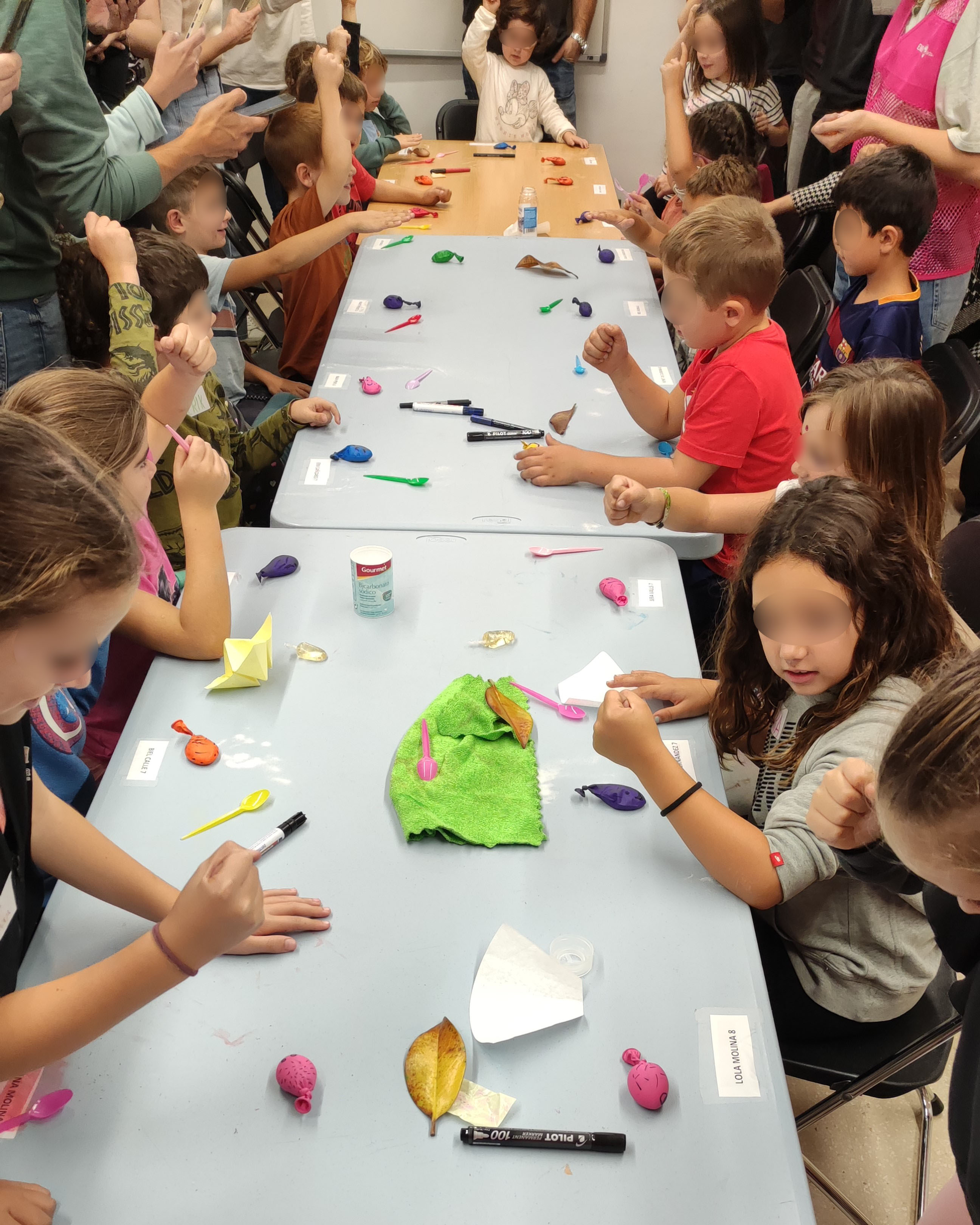 Acompanyats de les seves famílies, les nenes i els nens de Riudellots van poder fer un munt de tallers com per exemple: escriure missatges secrets, fer peixos globus que s'inflaven, experiments de capil·laritat i fer escumes divertides de colors.
