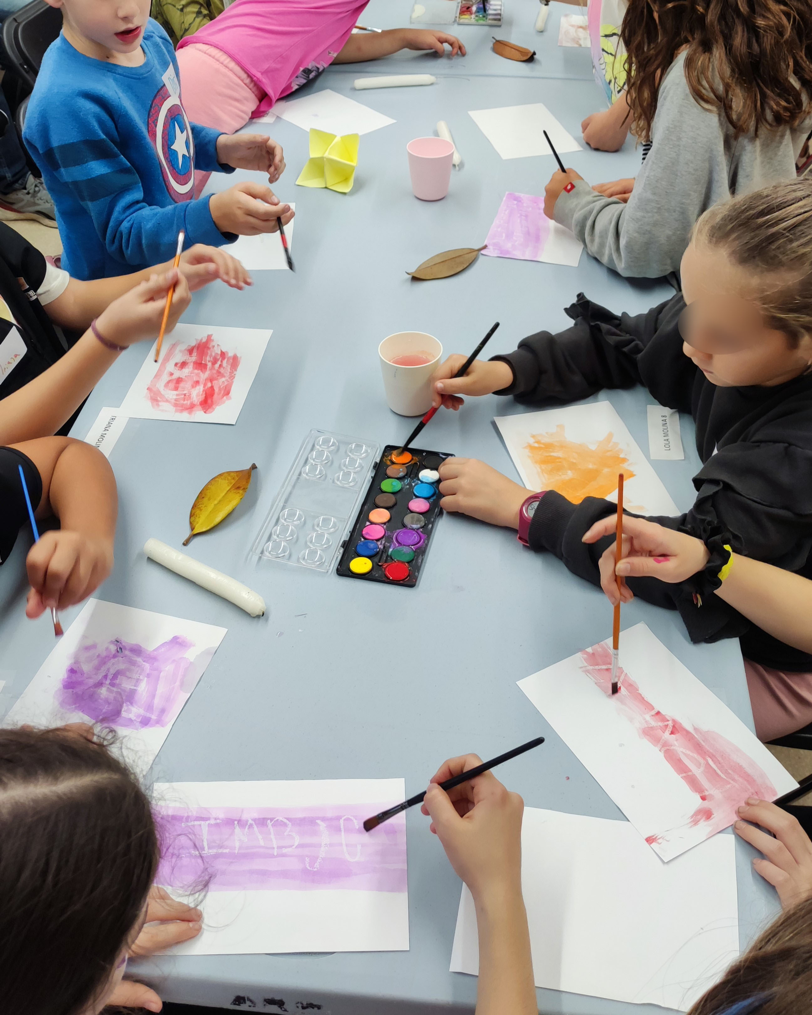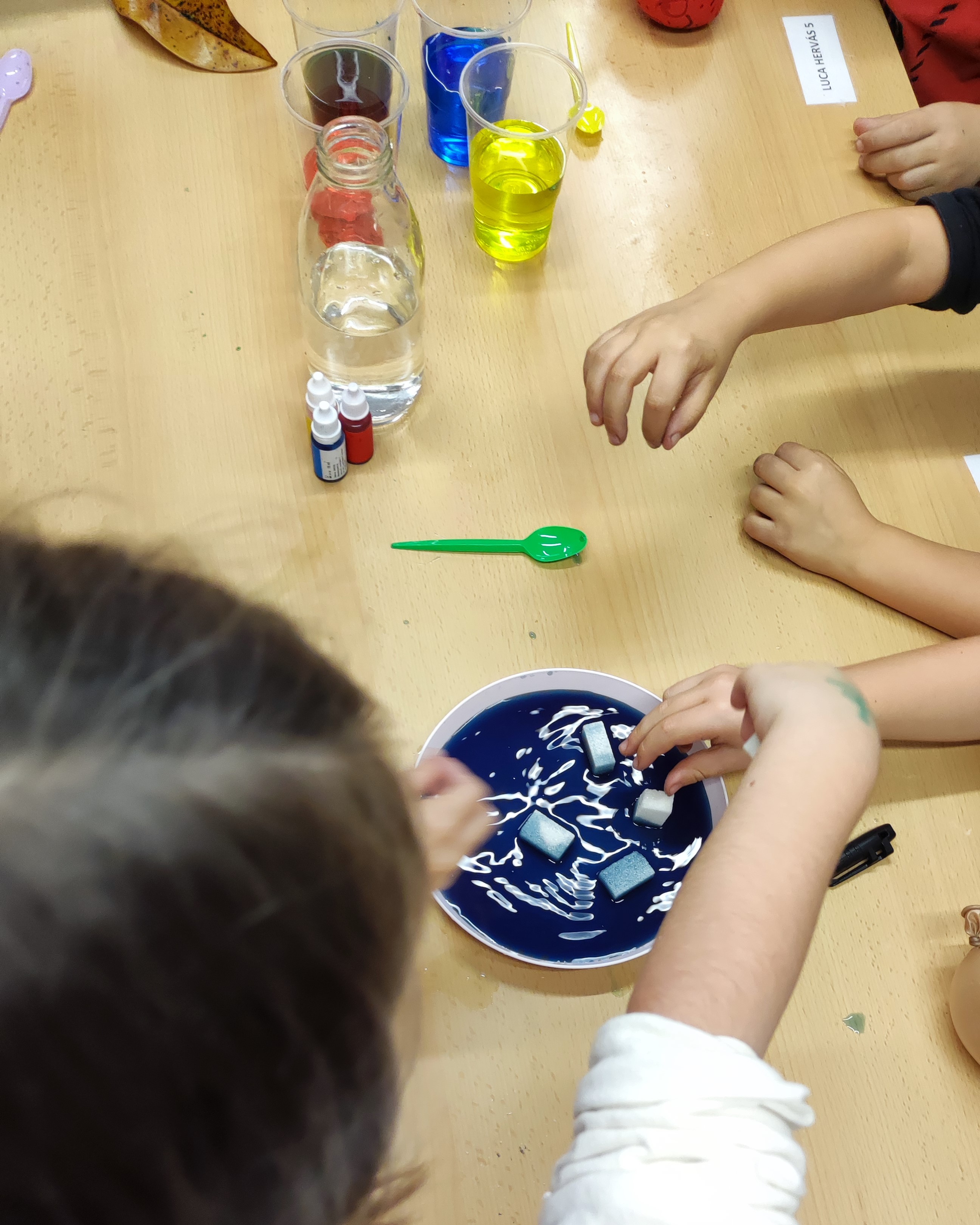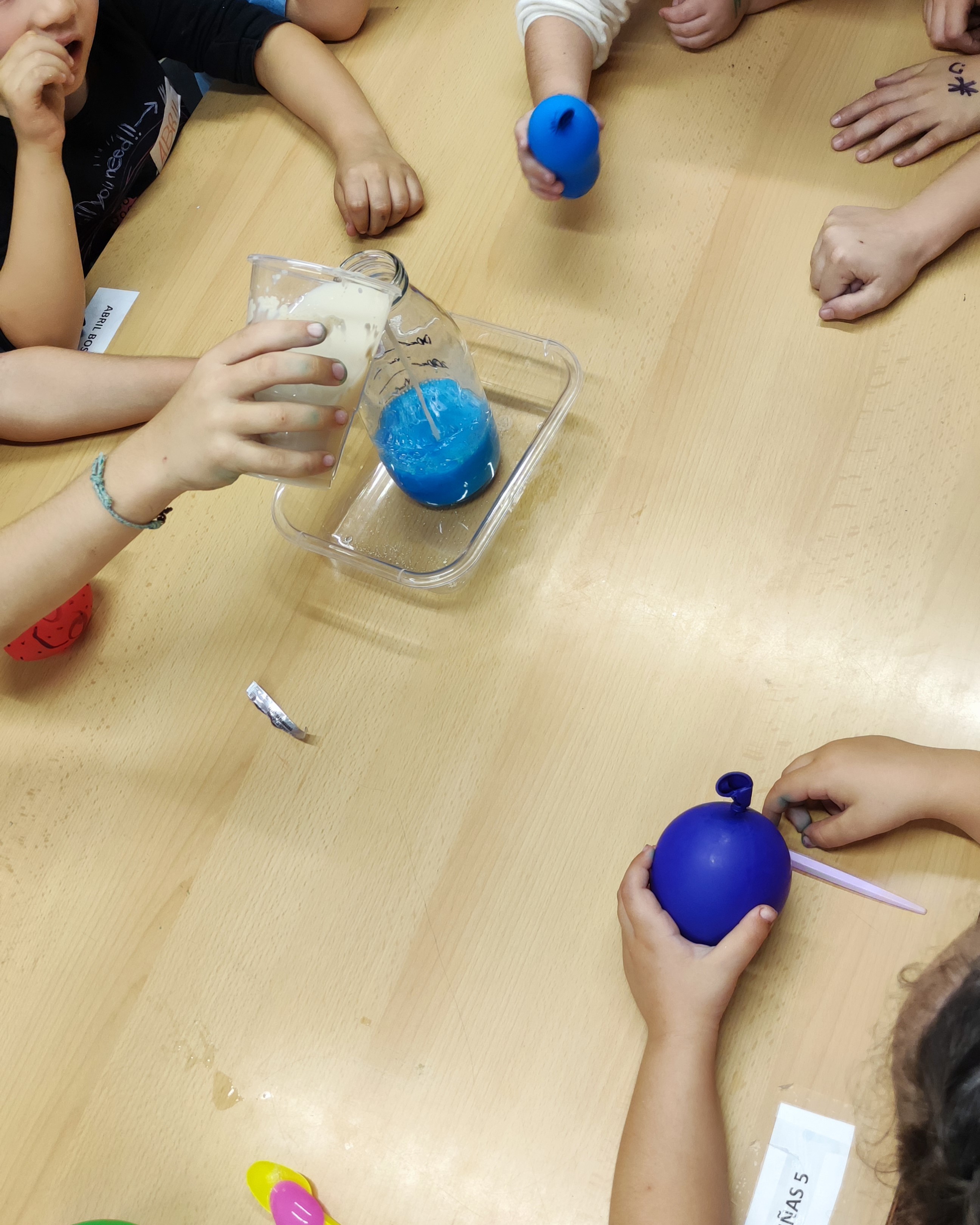 Acompanyats de les seves famílies, les nenes i els nens de Riudellots van poder fer un munt de tallers com per exemple: escriure missatges secrets, fer peixos globus que s'inflaven, experiments de capil·laritat i fer escumes divertides de colors.